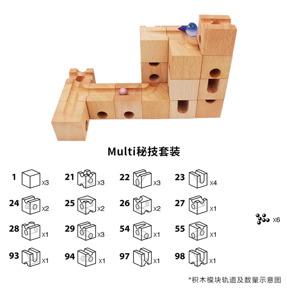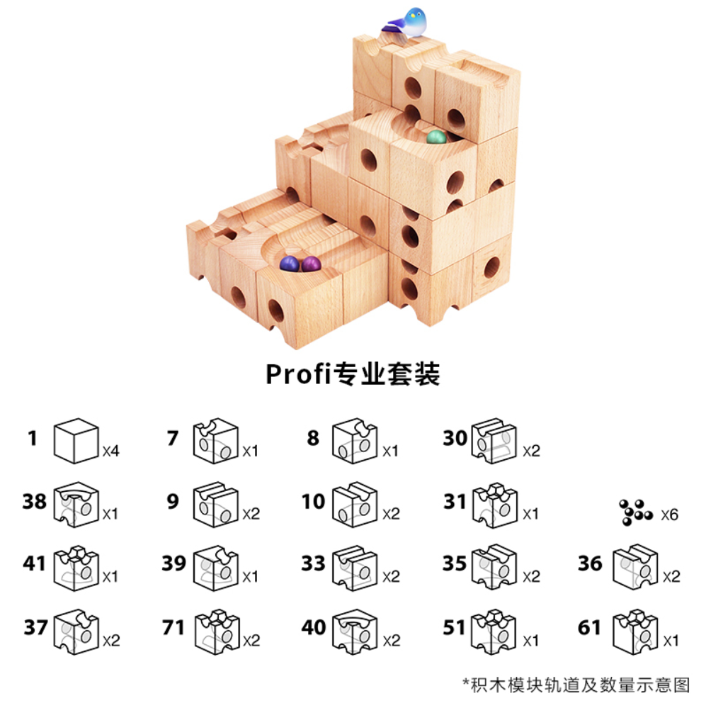 秘技款轨道积木套装是一款极具挑战性和创新性的高级建筑玩具,共包含30块精选榉木积木。这套积木以其独特的设计和多功能性著称,专为那些寻求超越传统建筑玩具限制的孩子和成人设计。